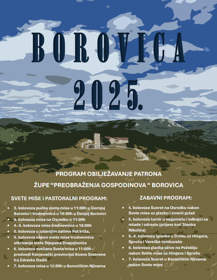 Dragi župljani, mještani Borovice, iseljenici i prijatelji, pozivamo vas da od 3. do 7. kolovoza 2025. godine zajednički obilježimo blagdan Preobraženja Gospodinova, patron naše župe, kroz bogat duhovni i zabavni program. SVETE MISE I PASTORALNI…