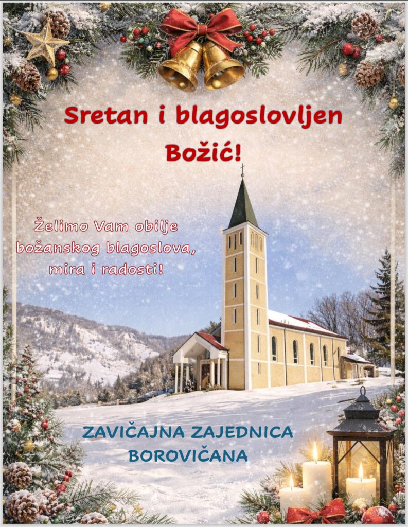 Zavičajna zajednica Borovičana svim Borovičanima i prijateljima Borovice želi blagoslovljen i radostan Božić. Neka rođenje Kristovo ispuni vaša srca mirom, ljubavlju i nadom te vas okupi u toplini obitelji i zavičaja, ma gdje bili!