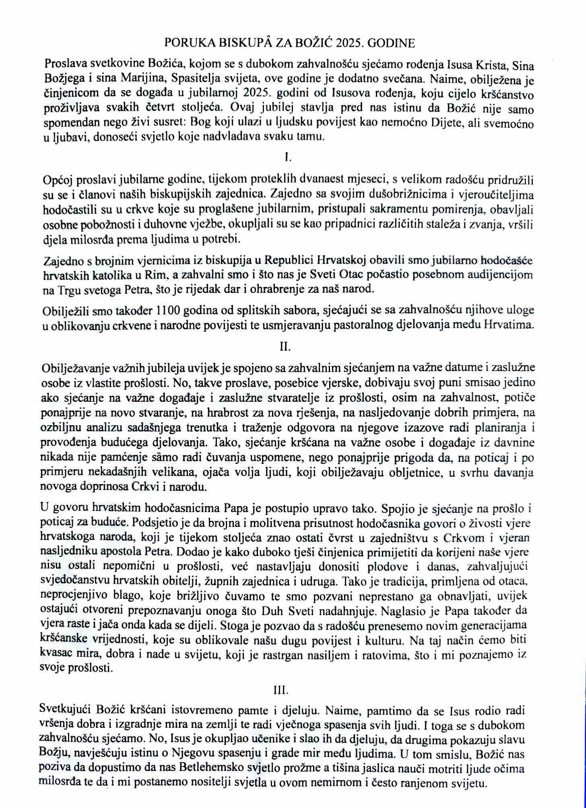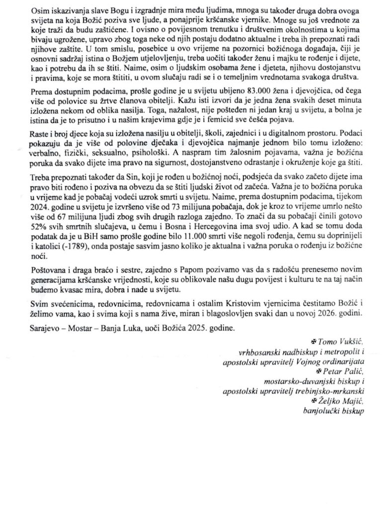 Božić nas podsjeća da nije riječ samo o sjećanju, nego o živom susretu s Bogom koji donosi svjetlo, mir i nadu svijetu. U jubilarnoj godini posebno smo pozvani čuvati dostojanstvo svakog ljudskog života, štititi žene i djecu te prenositi kršćanske vrijednosti novim naraštajima. Neka betlehemsko svjetlo osnaži naša srca da budemo nositelji mira, dobra i nade u ovom nemirnom vremenu.