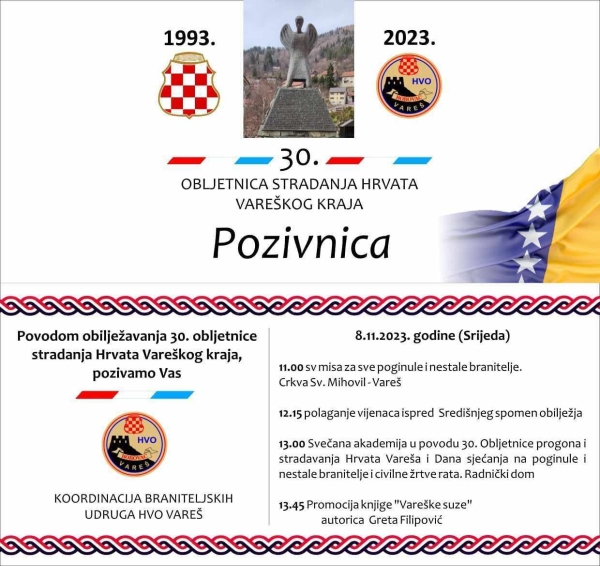 Koordinacijski odbor udruga proisteklih iz domovinskog rata HVO-a Općine Vareš organizira obilježavanje 30. obljetnice stradanja Hrvata vareškog kraja, Dan sjećanja na poginule i nestale branitelje…